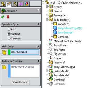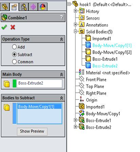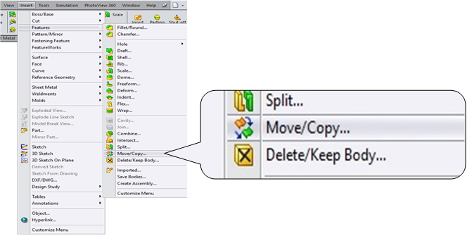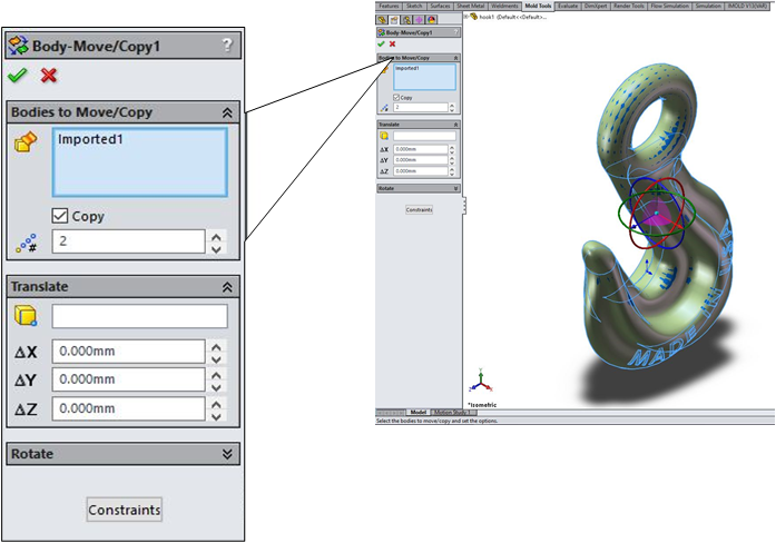 Core dan Cavity hasil dari Subtract. Untuk membuka antara Core dan Cavity bisa menggunakan feature Move/Copy. Dan untuk menyimpan Core atau Cavity menjadi part baru bisa klik kanan di Solid Body Core atau Cavity dan pilih Insert into New Part.Dalam pembuatan mold yang lebih kompleks bisa menggunakan add-ins solidworks yaitu iMOLD (www.imold.com )