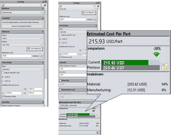 Desainer dapat membuat keputusan desain yang lebih cepat, berulang, dan terinformasi berdasarkan biaya, dan mengubah desain untuk menurunkan biaya produksi. Produsen dapat mengotomatiskan proses penawarannya. Template biaya alat dapat disesuaikan, memungkinkan untuk memasukkan biaya produksi dan data spesifik, seperti bahan, tenaga kerja, kecepatan dan alat berat, dan biaya pemasangan.