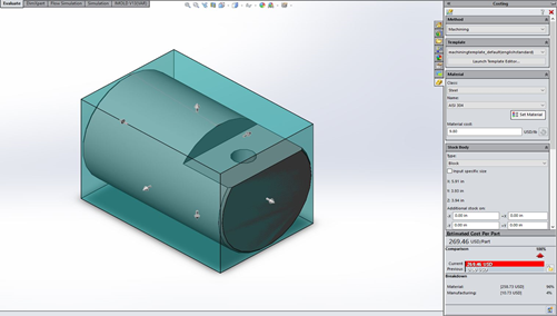 - Klik Evaluate pada toolbar dan klik Costing. Maka akan muncul di Task Pane menu Costing seperti pada gambar berikut. Terlihat harga sekarang adalah 269.46 USD/part, dengan metode,material,dan stock body yang terlihat pada gambar. Namun semua parameter tersebut bisa kita edit sesuai kebutuhan.
